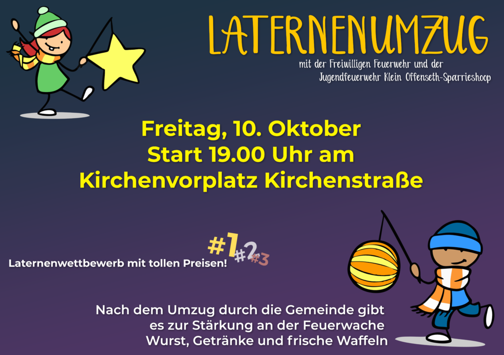 Wir starten zusammen mit dem Spielmannszug um 19:00 Uhr an der Kirche. Der Wettbewerb um die schönste selbstgebastelte Laterne startet bereits um 18:30 Uhr.