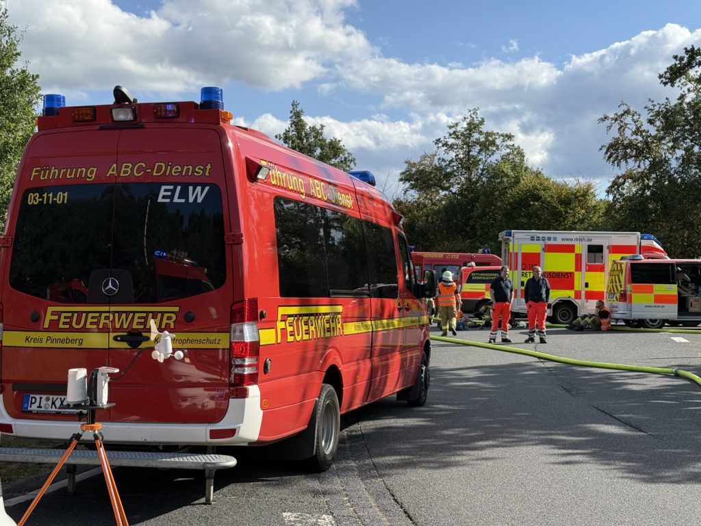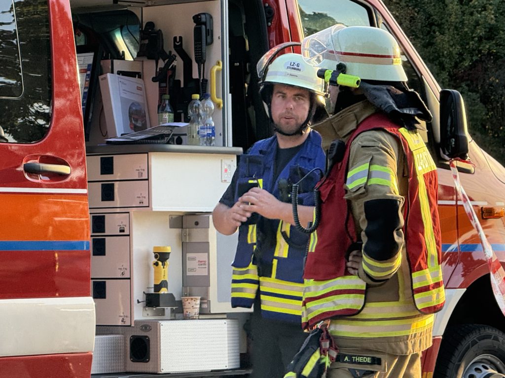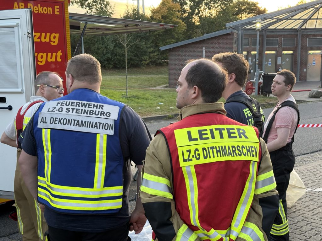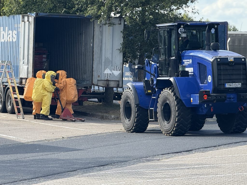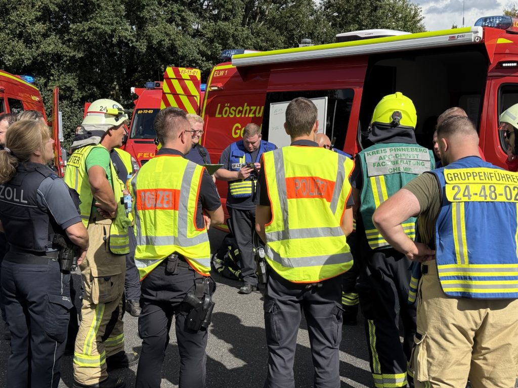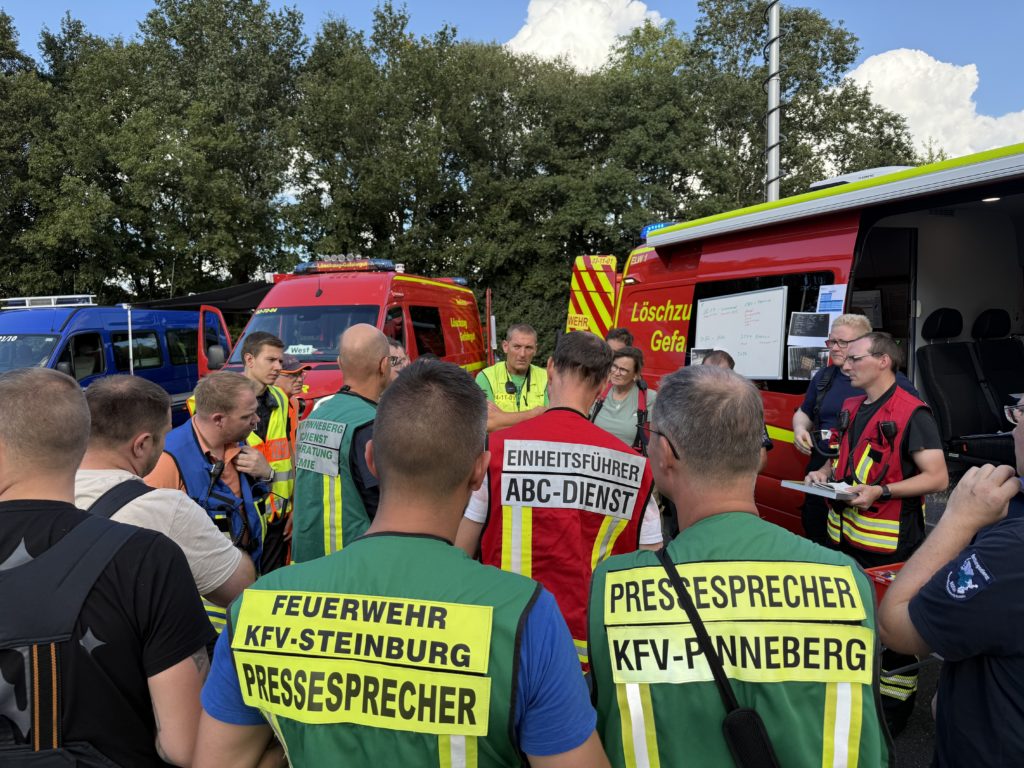 Zusätzlich zu den o.g. Kräften waren auch die THW-Ortverbände aus Barmstedt, Itzehoe und Elmshorn mit ihren Fachberatern und den Fachgruppen Bergen & Räumen zur Unterstützung beim Entleeren des Containers vor Ort. Die Autobahnmeisterei Steinburg sowie die Landespolizei Schleswig-Holstein übernahmen die Absperrung der Einsatzstelle. Die Rettungsdienst-Kooperation in Schleswig-Holstein (RKiSH) sicherte uns alle gegen eventuelle Not- und Unfälle ab, und die DRK-Bereitschaften aus Itzehoe sowie Glückstadt übernahmen zusammen mit Kameraden der Johannitern aus Steinburg die Verpflegung für die rund 100 Kameraden bei dem mehr als 10-stündigen Einsatz. Der Kreisfeuerwehrverband Pinneberg versorgte uns nach dem Einsatz mit frischen Schläuchen und neuen Atemluftflaschen.