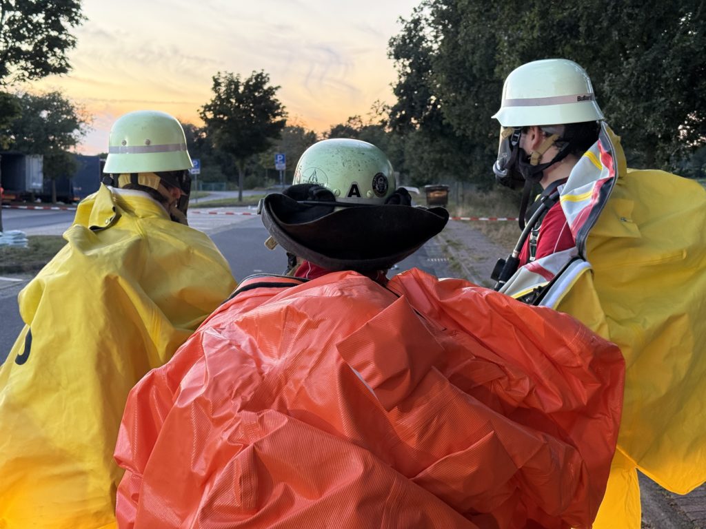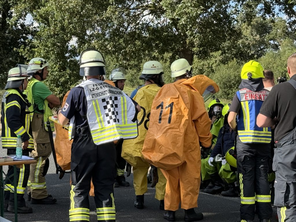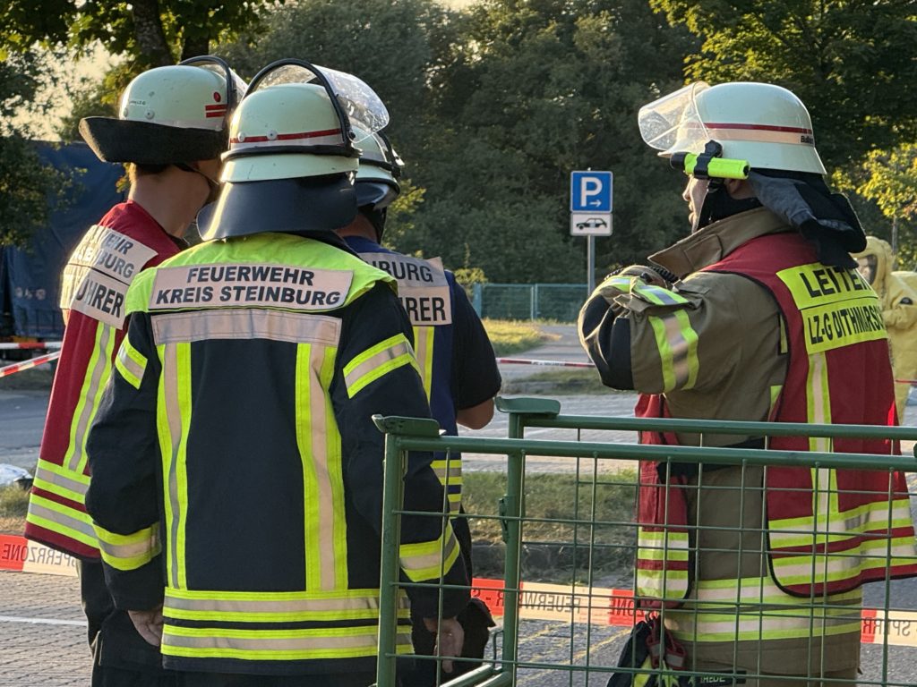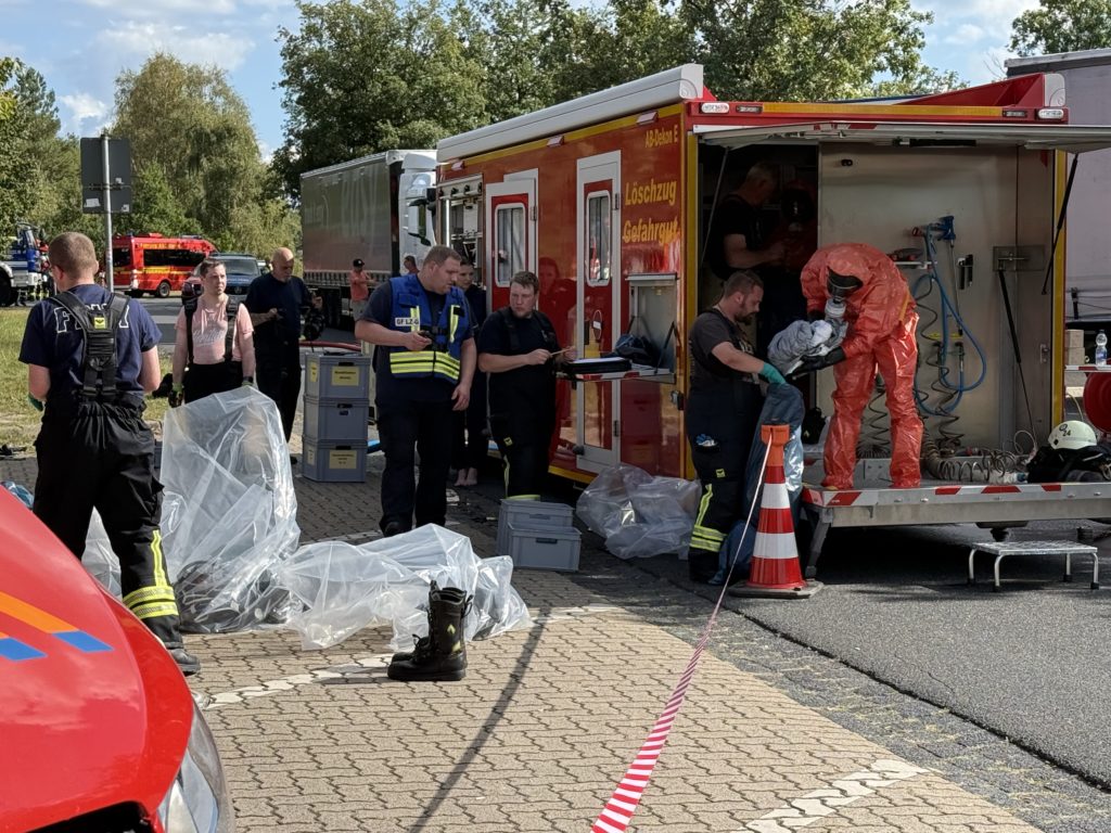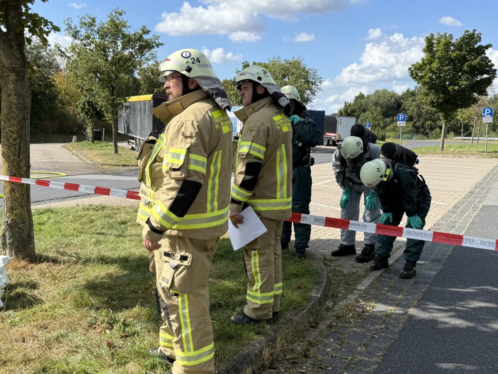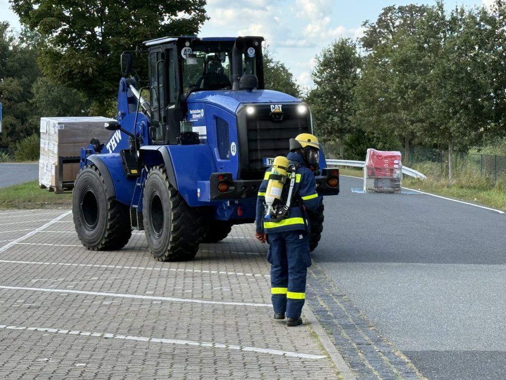 Zusätzlich zu den o.g. Kräften waren auch die THW-Ortverbände aus Barmstedt, Itzehoe und Elmshorn mit ihren Fachberatern und den Fachgruppen Bergen & Räumen zur Unterstützung beim Entleeren des Containers vor Ort. Die Autobahnmeisterei Steinburg sowie die Landespolizei Schleswig-Holstein übernahmen die Absperrung der Einsatzstelle. Die Rettungsdienst-Kooperation in Schleswig-Holstein (RKiSH) sicherte uns alle gegen eventuelle Not- und Unfälle ab, und die DRK-Bereitschaften aus Itzehoe sowie Glückstadt übernahmen zusammen mit Kameraden der Johannitern aus Steinburg die Verpflegung für die rund 100 Kameraden bei dem mehr als 10-stündigen Einsatz. Der Kreisfeuerwehrverband Pinneberg versorgte uns nach dem Einsatz mit frischen Schläuchen und neuen Atemluftflaschen.