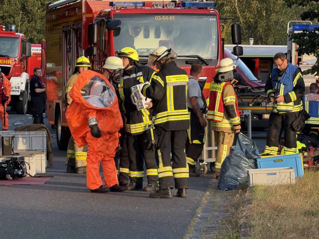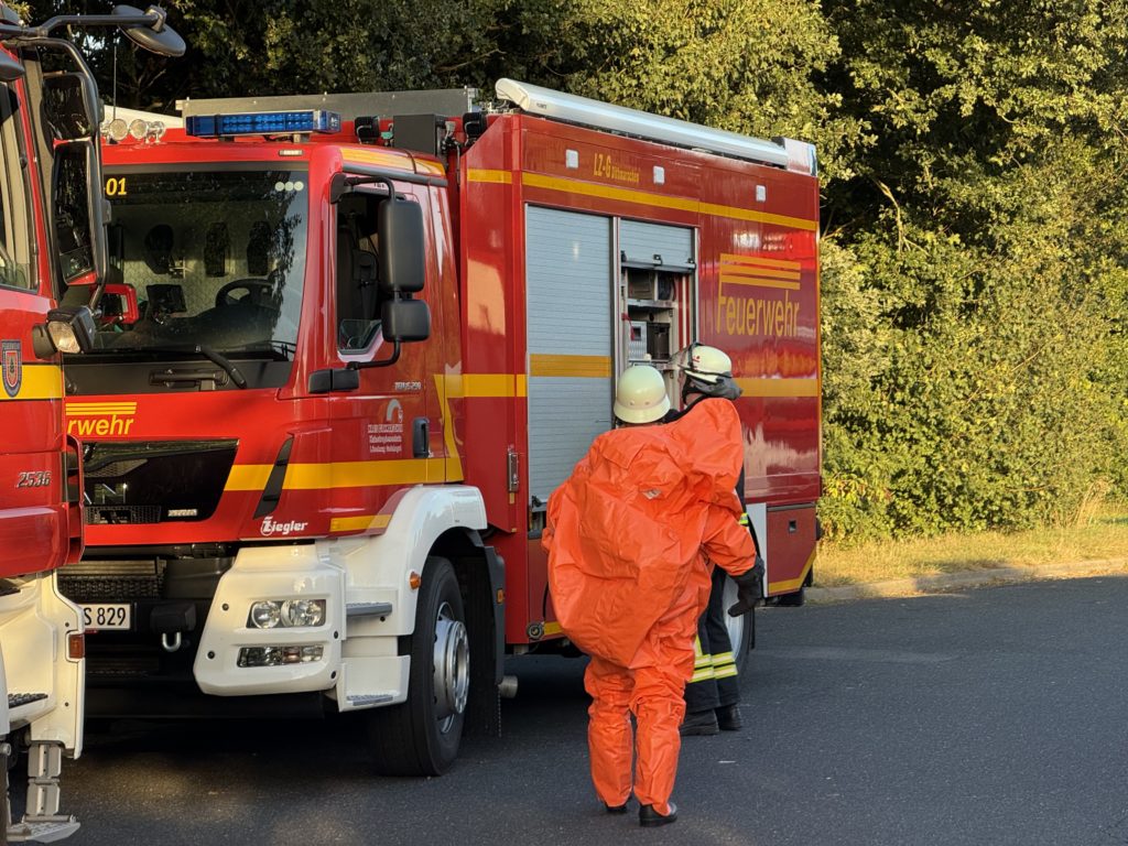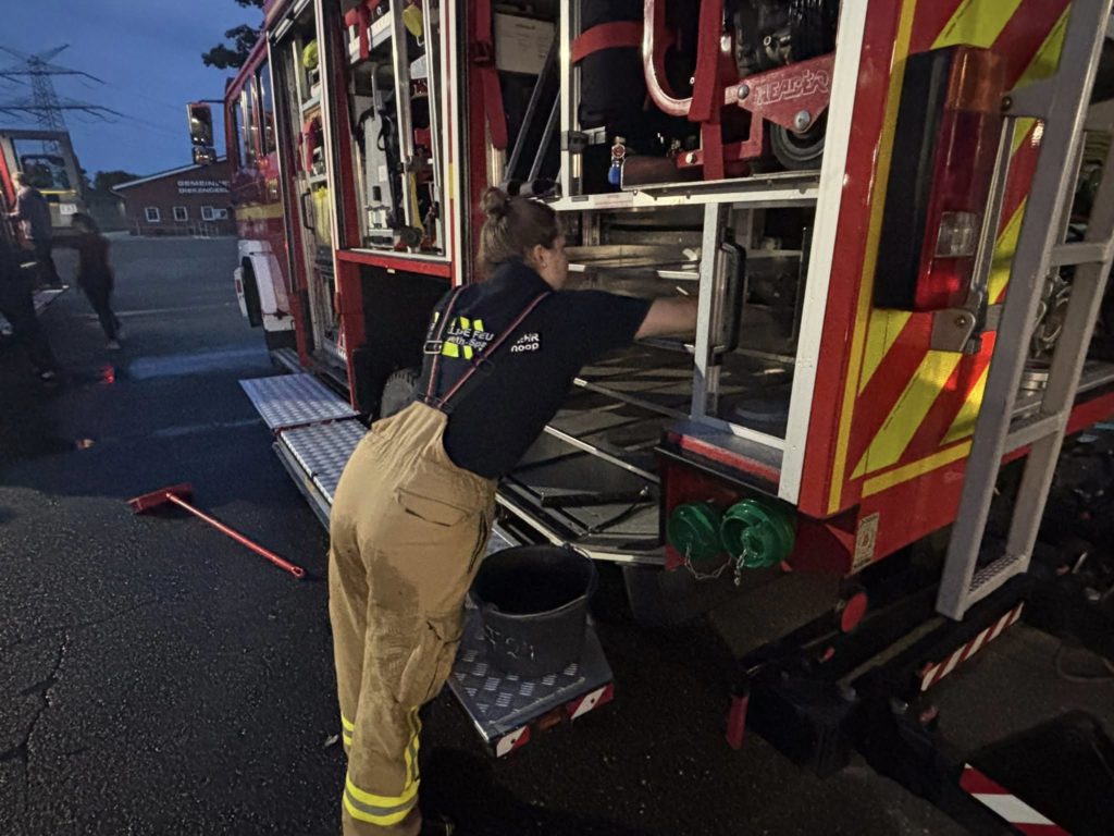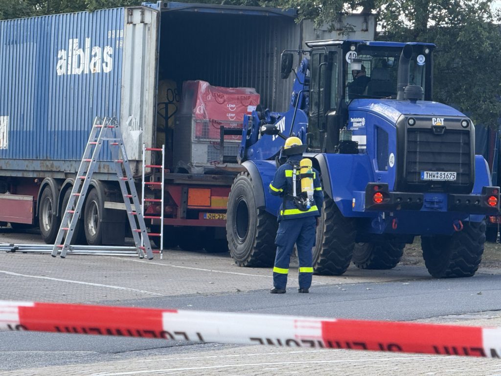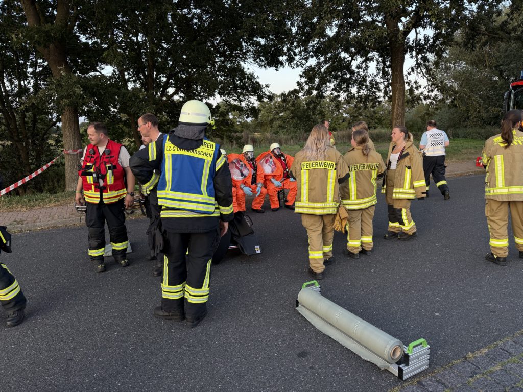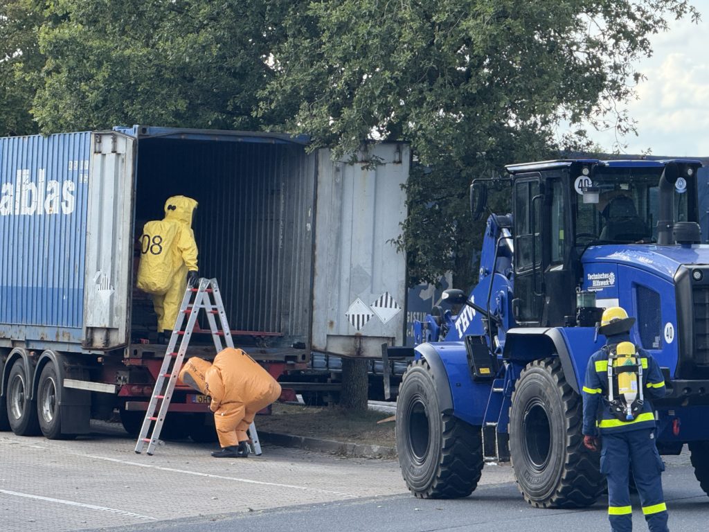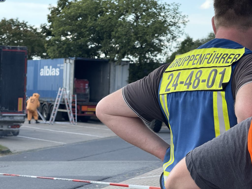 Die leckgeschlagene Kiste wurde letztendlich ganz hinten auf dem Container gefunden, so dass annähernd die gesamte Ladung in Handarbeit durch die CSA-Träger entladen werden musste. Zur Bestimmung der ausgasenden Stoffe wurden verschiedene Fachberater hinzu gezogen, ebenso wie der Löschzug Gefahrgut – eine Kreis-Einheit, die sich auf den Umgang mit Gefahrstoffen spezialisiert hat. Um 13:33 Uhr schrillten erneut die Sirenen in Klein Offenseth-Sparrieshoop: Es wurden weitere Atemschutzgeräteträger benötigt. Da auch diese Kräfte nicht ausreichten, waren am Ende die Einheiten „Löschzug Gefahrgut“ aus den Kreisen Steinburg, Pinneberg und Dithmarschen an der Einsatzstelle, zusätzlich die Feuerwehr Groß Offenseth-Aspern. Um 16:19 Uhr wurden auch die weiteren Nicht-Atemschutzgeräteträger unserer Feuerwehr dazu alarmiert und um 22:59 Uhr alle anderen (ggf. erneut), um nach Einsatzende auf den Fahrzeugen und in der Wache wieder „klar Schiff zu machen“ – immerhin kann jederzeit zum nächsten Einsatz alarmiert werden. Die Aufräumarbeiten dauerten bis ca. 2:00 Uhr nachts an.