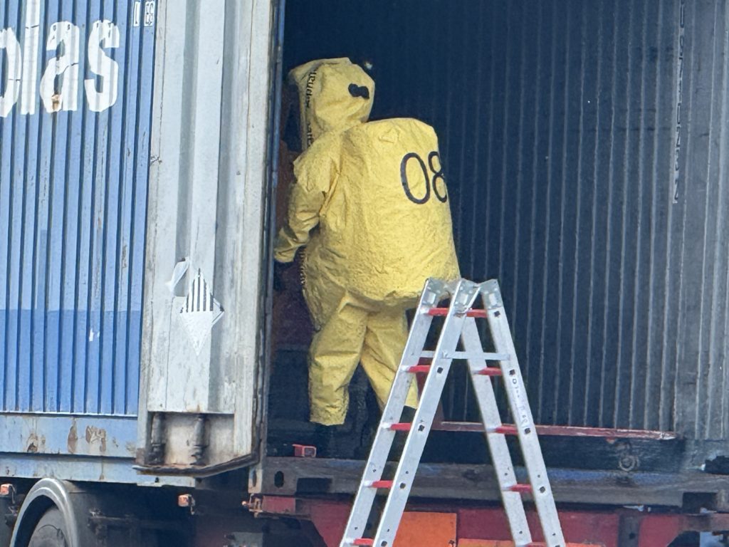 Vor Ort stellten wir fest, dass das Fahrzeug eine Vielzahl verschiedener Gefahrstoffe geladen hatte und dass von außen nicht ersichtlich (oder zugänglich) war, welche Behältnisse betroffen sind.