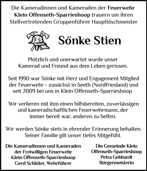 Der plötzliche und unerwartete Tod unseres Kameraden Sönke trifft natürlich nicht nur uns, sondern in besonderem Maße auch und vor allem seine Familie.