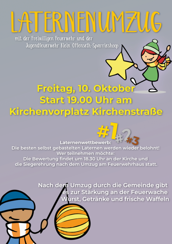 Wir starten zusammen mit dem Spielmannszug um 19:00 Uhr an der Kirche. Der Wettbewerb um die schönste selbstgebastelte Laterne startet bereits um 18:30 Uhr.